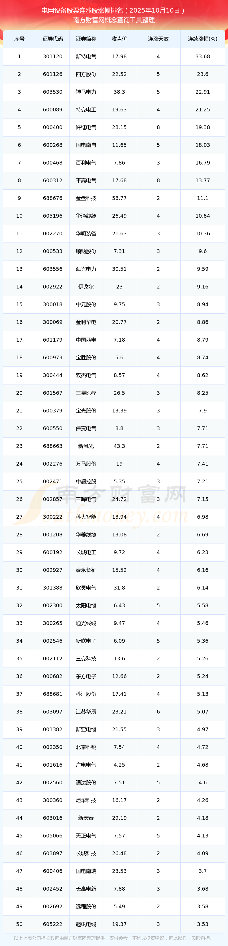 2025年10月10日電網(wǎng)設(shè)備股票連漲股漲幅排名