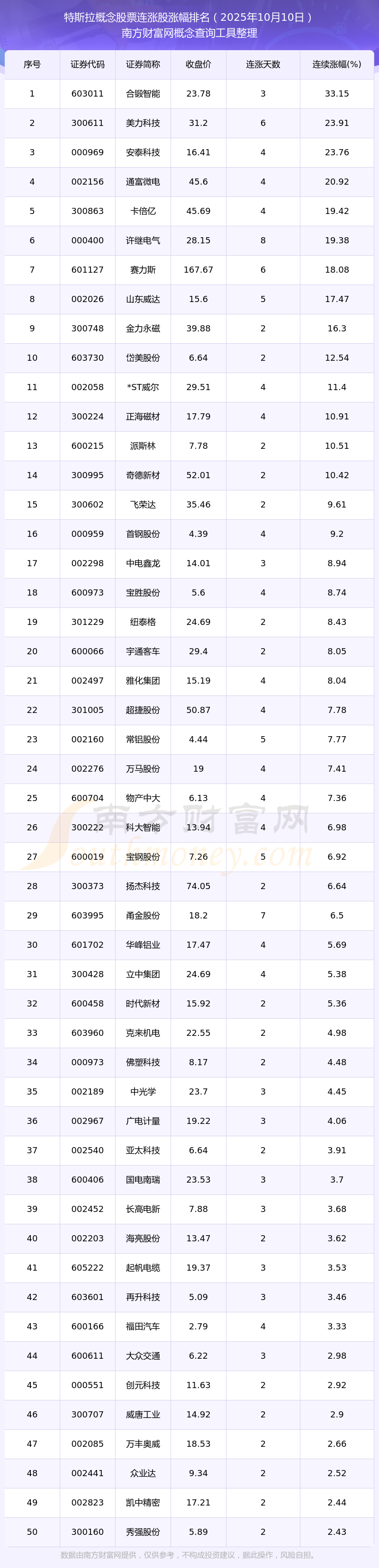 根據(jù)南方財(cái)富網(wǎng)概念查詢工具數(shù)據(jù)統(tǒng)計(jì),截止2025年10月10日收盤,特斯拉概念股票共有71只個(gè)股實(shí)現(xiàn)連漲。其中連續(xù)漲幅較大的個(gè)股有合鍛智能、美力科技、安泰科技等,連續(xù)漲幅分別為33.15%、23.91%、23.76%。