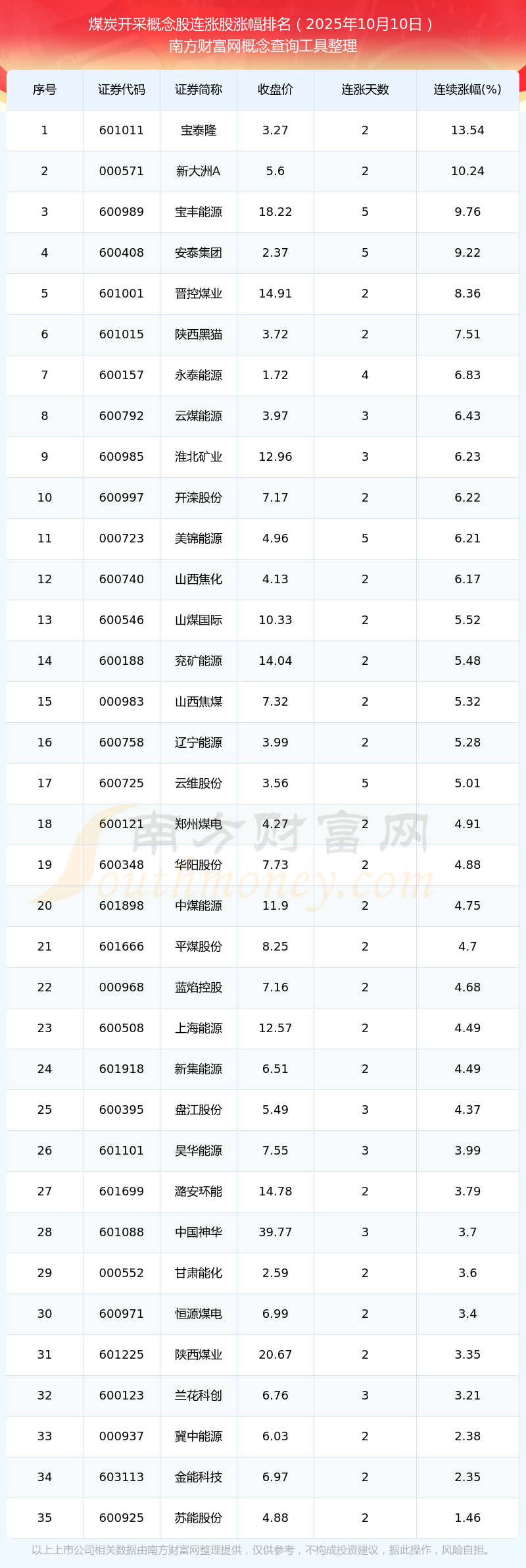 2025年10月10日煤炭開(kāi)采概念股連漲股票漲幅排名