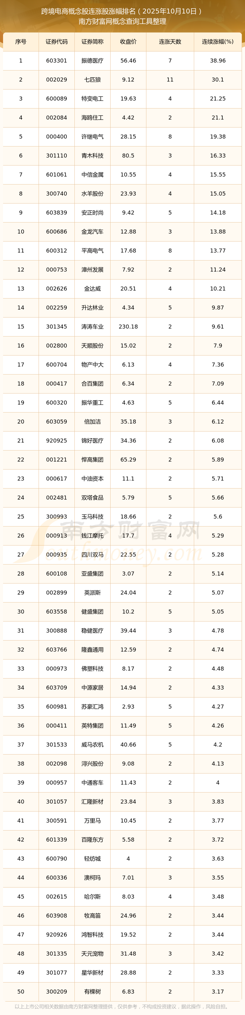 2025年10月10日跨境電商概念股連漲股漲幅排名