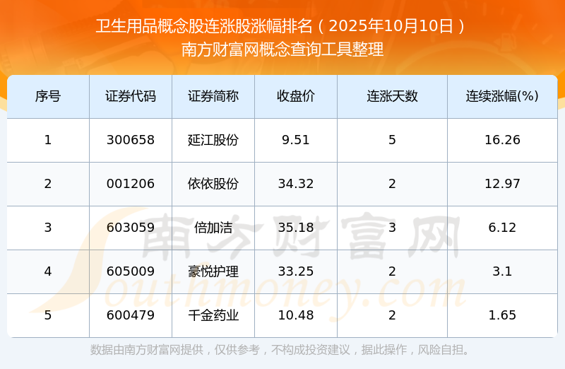 2025年10月10日衛(wèi)生用品概念股連漲股漲幅排名
