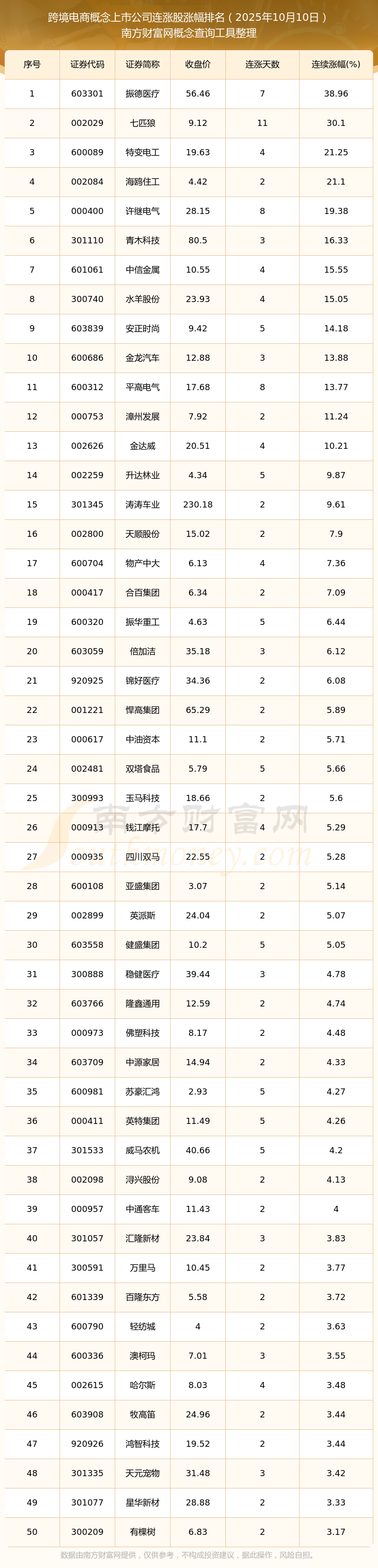 2025年10月10日跨境電商概念上市公司連漲股漲幅排名