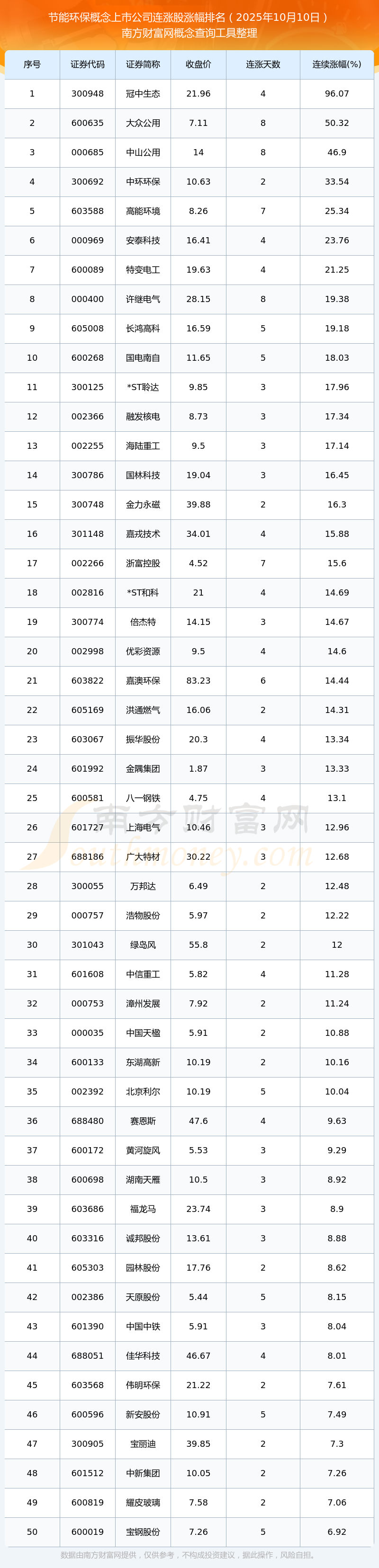 2025年10月10日節(jié)能環(huán)保概念上市公司連漲股漲幅排名