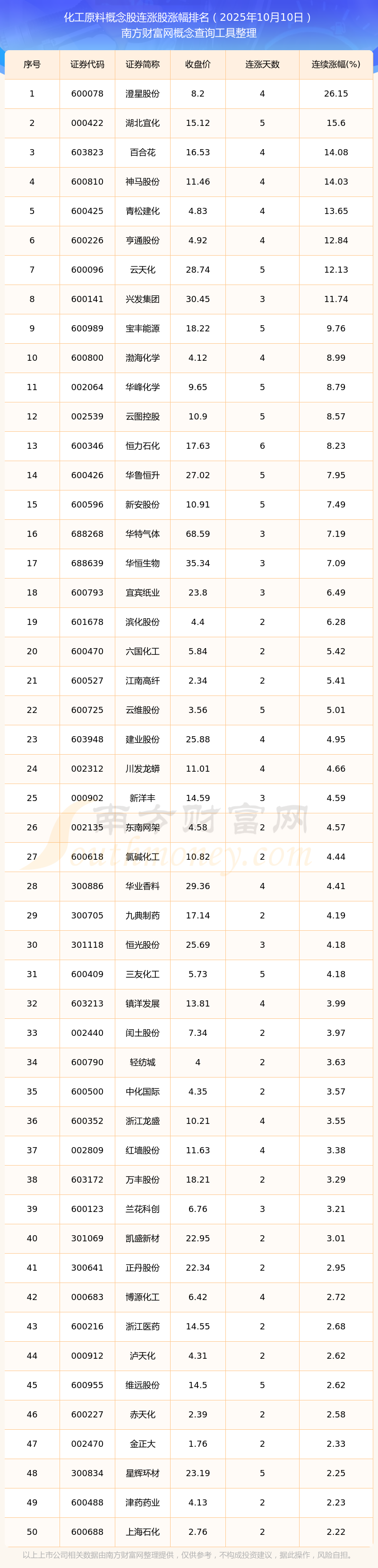 2025年10月10日化工原料概念股連漲股漲幅排名