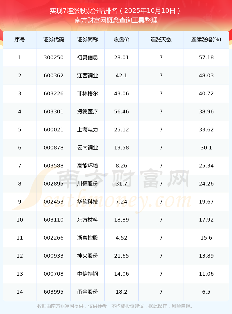 根據(jù)南方財(cái)富網(wǎng)概念查詢工具數(shù)據(jù)統(tǒng)計(jì),截止2025年10月10日收盤(pán),共有14只個(gè)股實(shí)現(xiàn)7天連漲。其中連續(xù)漲幅較大的個(gè)股有初靈信息、江西銅業(yè)、菲林格爾等,連續(xù)漲幅分別為57.18%、48.03%、40.72%。