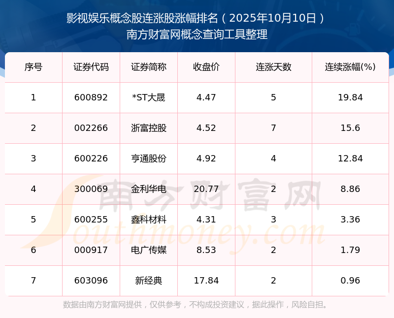 根據(jù)南方財(cái)富網(wǎng)概念查詢工具數(shù)據(jù)統(tǒng)計(jì),截止2025年10月10日收盤,影視娛樂概念股共有7只個(gè)股實(shí)現(xiàn)連漲。其中連續(xù)漲幅較大的個(gè)股有*ST大晟、浙富控股、亨通股份等,連續(xù)漲幅分別為19.84%、15.60%、12.84%。