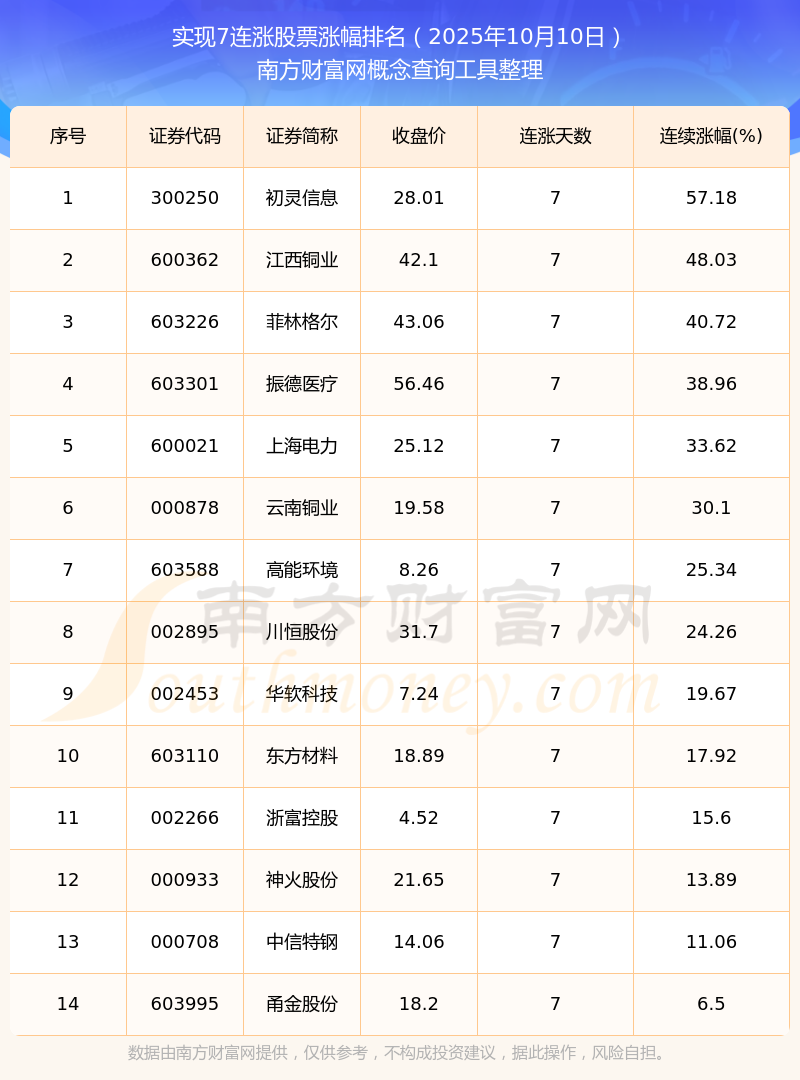 根據(jù)南方財(cái)富網(wǎng)概念查詢工具數(shù)據(jù)統(tǒng)計(jì),截止2025年10月10日收盤,共有14只個(gè)股實(shí)現(xiàn)7天連漲。其中連續(xù)漲幅較大的個(gè)股有初靈信息、江西銅業(yè)、菲林格爾等,連續(xù)漲幅分別為57.18%、48.03%、40.72%。