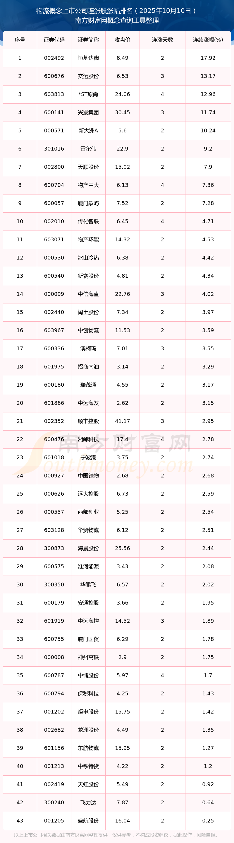 2025年10月10日物流概念上市公司連漲股票漲幅排名