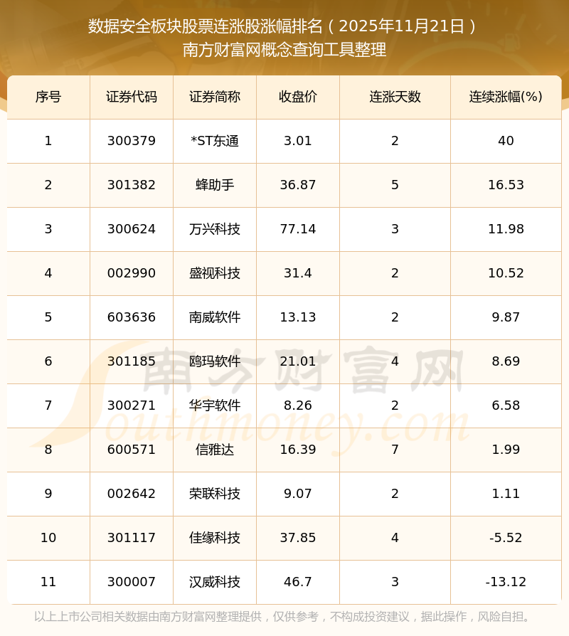 2025年11月21日數(shù)據(jù)安全板塊股票連漲股漲幅排名