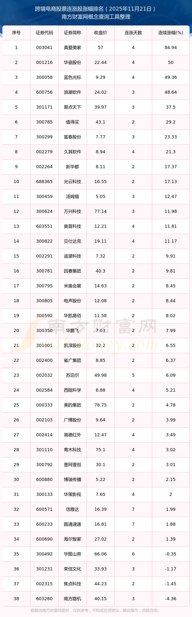 根據(jù)南方財富網(wǎng)概念查詢工具數(shù)據(jù)統(tǒng)計,截止2025年11月21日收盤,跨境電商股票共有38只個股實現(xiàn)連漲。其中連續(xù)漲幅較大的個股有真愛美家、華瓷股份、藍色光標等,連續(xù)漲幅分別為84.94%、50.00%、49.36%。