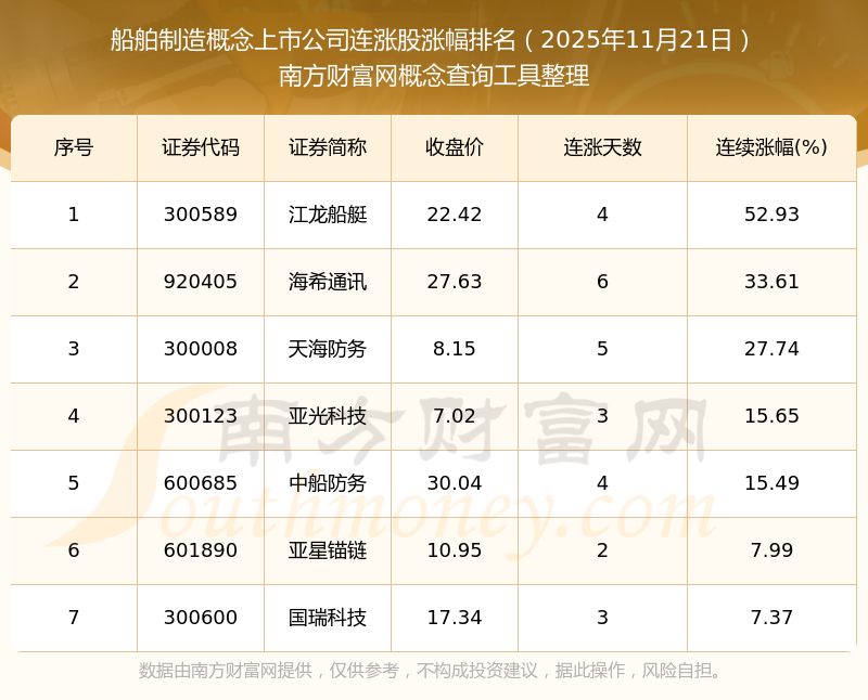 根據(jù)南方財(cái)富網(wǎng)概念查詢工具數(shù)據(jù)統(tǒng)計(jì),截止2025年11月21日收盤,船舶制造概念上市公司共有7只個股實(shí)現(xiàn)連漲。其中連續(xù)漲幅較大的個股有江龍船艇、海希通訊、天海防務(wù)等,連續(xù)漲幅分別為52.93%、33.61%、27.74%。