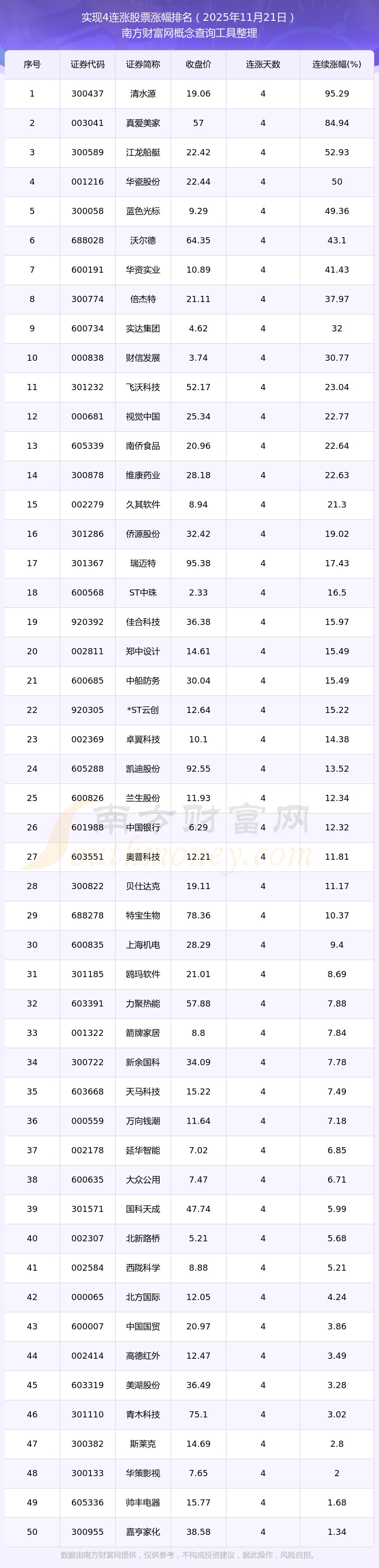 2025年11月21日實現(xiàn)4連漲股票漲幅排名