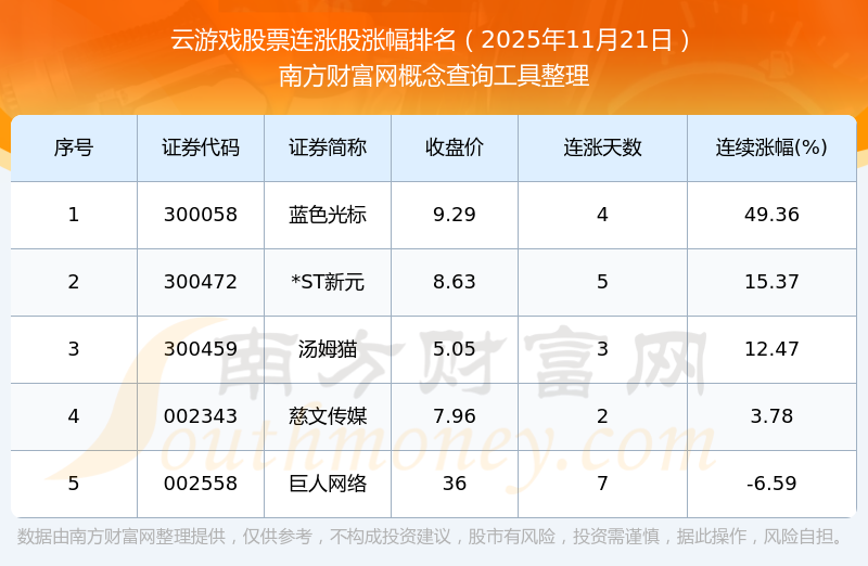 根據(jù)南方財(cái)富網(wǎng)概念查詢工具數(shù)據(jù)統(tǒng)計(jì),截止2025年11月21日收盤,云游戲股票共有5只個(gè)股實(shí)現(xiàn)連漲。其中連續(xù)漲幅較大的個(gè)股有藍(lán)色光標(biāo)、*ST新元、湯姆貓等,連續(xù)漲幅分別為49.36%、15.37%、12.47%。