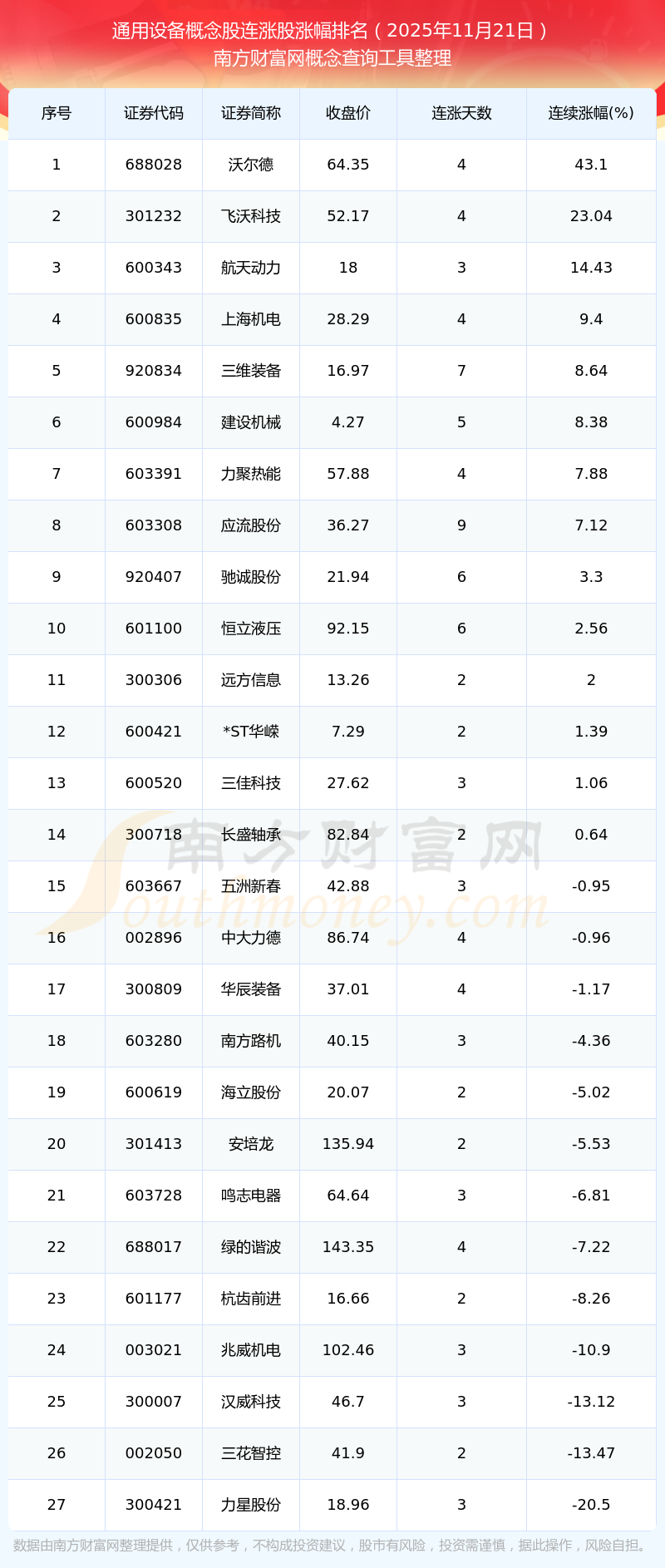 根據(jù)南方財富網(wǎng)概念查詢工具數(shù)據(jù)統(tǒng)計,截止2025年11月21日收盤,通用設(shè)備概念股共有27只個股實現(xiàn)連漲。其中連續(xù)漲幅較大的個股有沃爾德、飛沃科技、航天動力等,連續(xù)漲幅分別為43.10%、23.04%、14.43%。