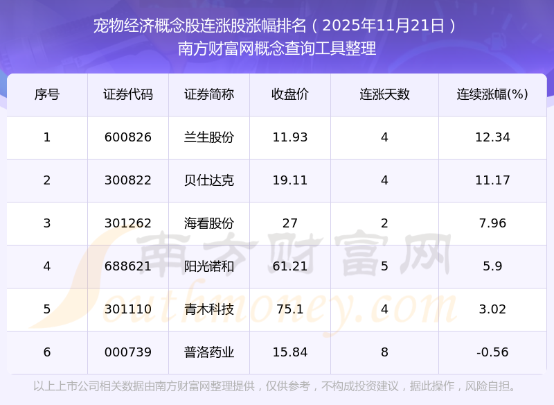 2025年11月21日寵物經(jīng)濟(jì)概念股連漲股漲幅排名
