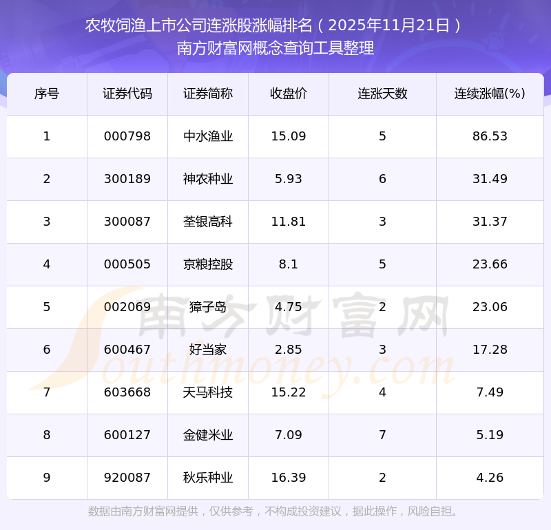 2025年11月21日農(nóng)牧飼漁上市公司連漲股漲幅排名