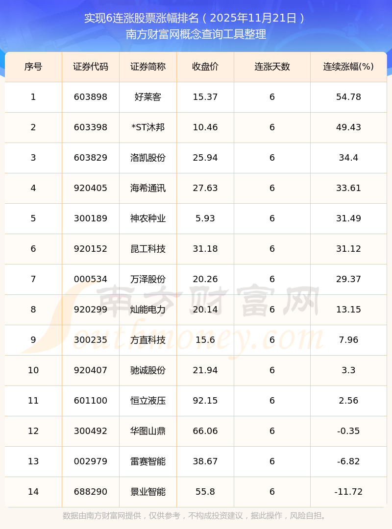 根據(jù)南方財富網(wǎng)概念查詢工具數(shù)據(jù)統(tǒng)計,截止2025年11月21日收盤,共有14只個股實現(xiàn)6天連漲。其中連續(xù)漲幅較大的個股有好萊客、*ST沐邦、洛凱股份等,連續(xù)漲幅分別為54.78%、49.43%、34.40%。