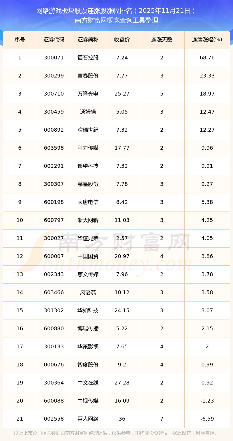 2025年11月21日網(wǎng)絡(luò)游戲板塊股票連漲股漲幅排名