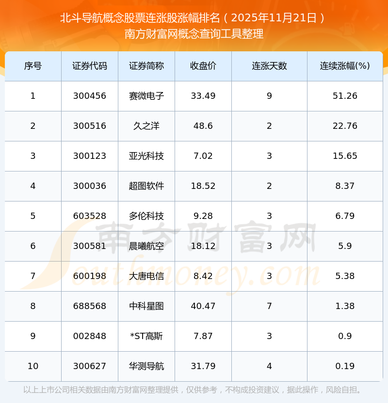 根據(jù)南方財富網(wǎng)概念查詢工具數(shù)據(jù)統(tǒng)計,截止2025年11月21日收盤,北斗導(dǎo)航概念股票共有10只個股實現(xiàn)連漲。其中連續(xù)漲幅較大的個股有賽微電子、久之洋、亞光科技等,連續(xù)漲幅分別為51.26%、22.76%、15.65%。