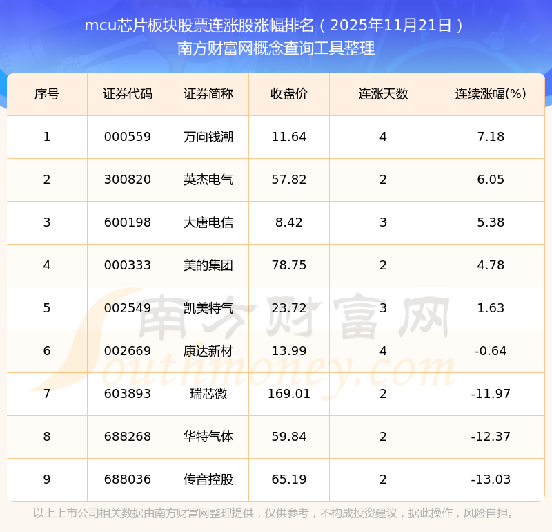 根據(jù)南方財富網(wǎng)概念查詢工具數(shù)據(jù)統(tǒng)計,截止2025年11月21日收盤,mcu芯片板塊股票共有9只個股實現(xiàn)連漲。其中連續(xù)漲幅較大的個股有萬向錢潮、英杰電氣、大唐電信等,連續(xù)漲幅分別為7.18%、6.05%、5.38%。