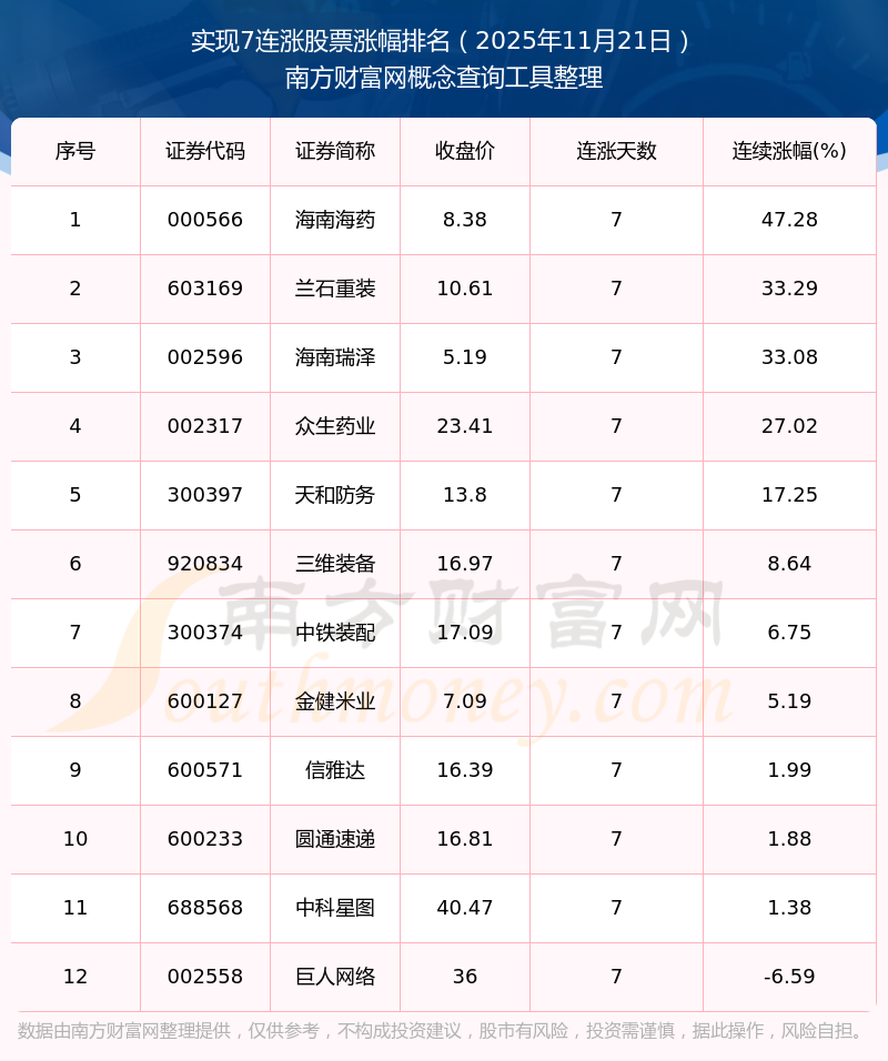 根據南方財富網概念查詢工具數據統(tǒng)計,截止2025年11月21日收盤,共有12只個股實現(xiàn)7天連漲。其中連續(xù)漲幅較大的個股有海南海藥、蘭石重裝、海南瑞澤等,連續(xù)漲幅分別為47.28%、33.29%、33.08%。