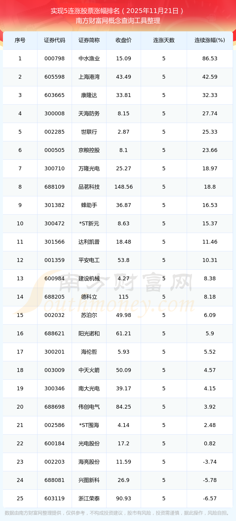 根據(jù)南方財富網(wǎng)概念查詢工具數(shù)據(jù)統(tǒng)計,截止2025年11月21日收盤,共有25只個股實現(xiàn)5天連漲。其中連續(xù)漲幅較大的個股有中水漁業(yè)、上海港灣、康隆達(dá)等,連續(xù)漲幅分別為86.53%、42.59%、32.33%。