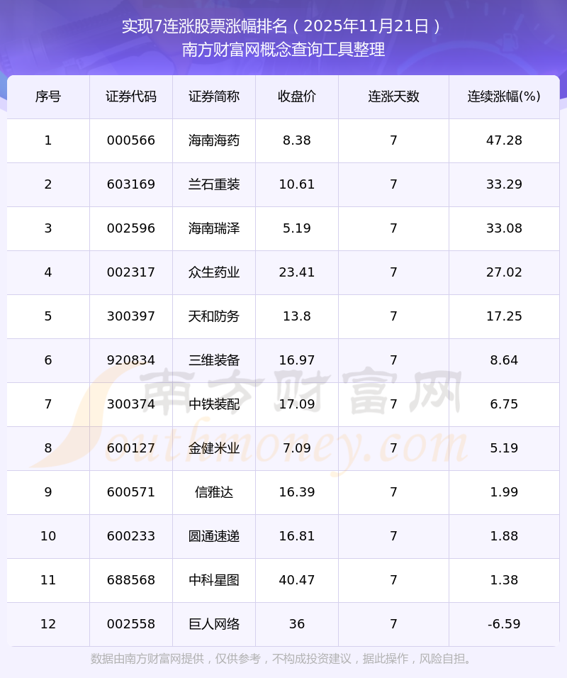 2025年11月21日實(shí)現(xiàn)7連漲股票漲幅排名