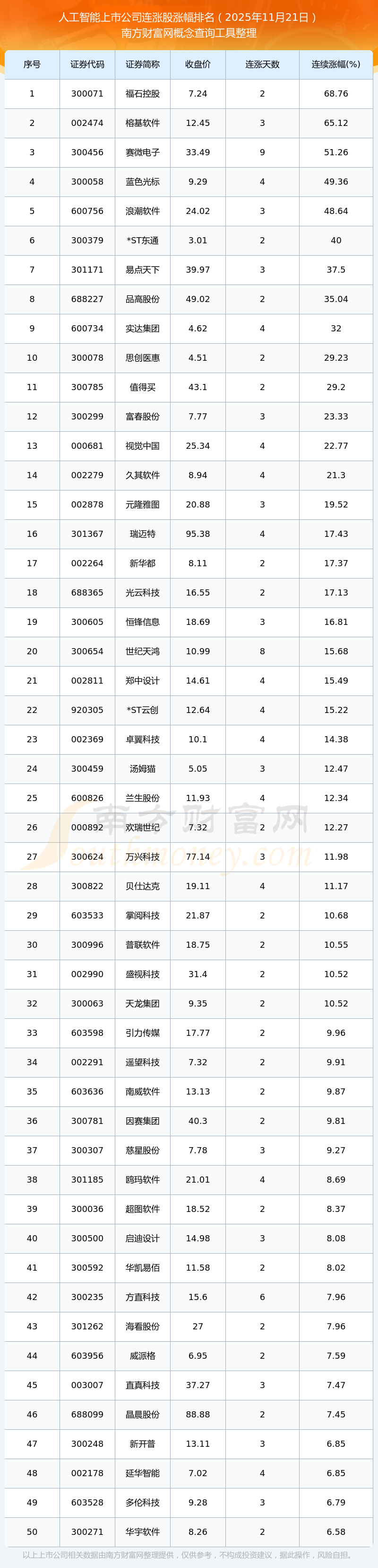 根據南方財富網概念查詢工具數據統計,截止2025年11月21日收盤,人工智能上市公司共有109只個股實現連漲。其中連續(xù)漲幅較大的個股有福石控股、榕基軟件、賽微電子等,連續(xù)漲幅分別為68.76%、65.12%、51.26%。
