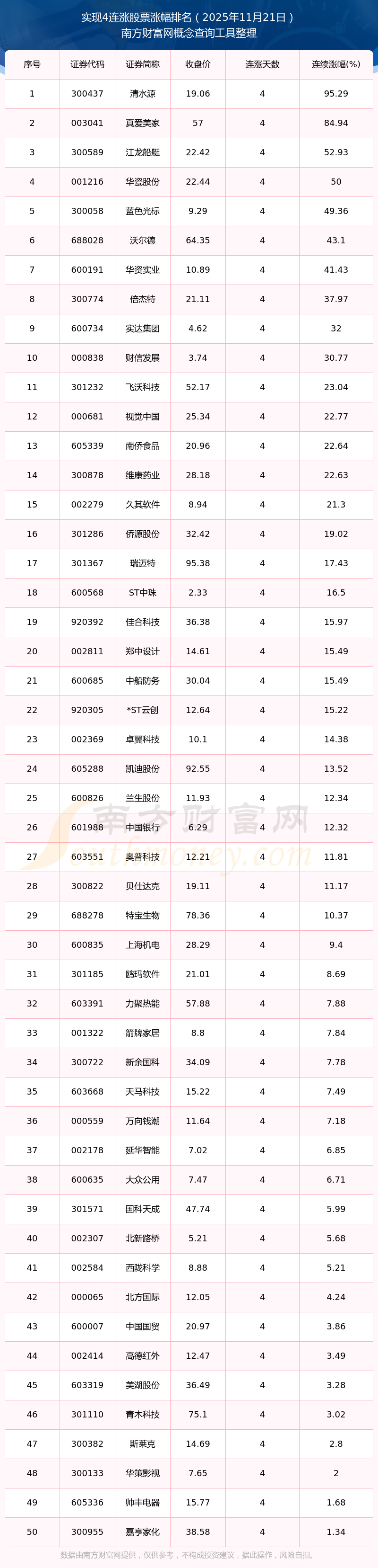 根據(jù)南方財(cái)富網(wǎng)概念查詢工具數(shù)據(jù)統(tǒng)計(jì),截止2025年11月21日收盤,共有65只個股實(shí)現(xiàn)4天連漲。其中連續(xù)漲幅較大的個股有清水源、真愛美家、江龍船艇等,連續(xù)漲幅分別為95.29%、84.94%、52.93%。