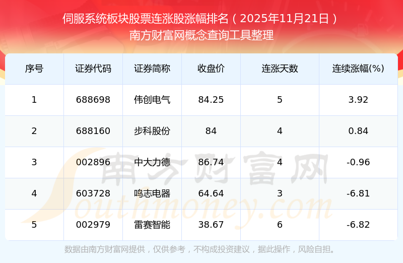2025年11月21日伺服系統(tǒng)板塊股票連漲股漲幅排名