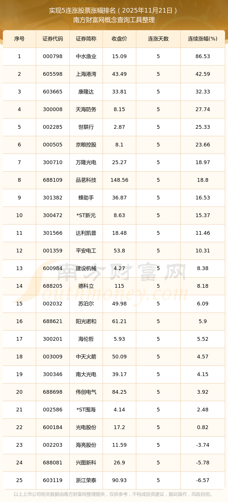 根據(jù)南方財(cái)富網(wǎng)概念查詢工具數(shù)據(jù)統(tǒng)計(jì),截止2025年11月21日收盤,共有25只個(gè)股實(shí)現(xiàn)5天連漲。其中連續(xù)漲幅較大的個(gè)股有中水漁業(yè)、上海港灣、康隆達(dá)等,連續(xù)漲幅分別為86.53%、42.59%、32.33%。