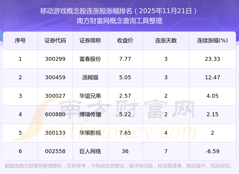 根據(jù)南方財(cái)富網(wǎng)概念查詢工具數(shù)據(jù)統(tǒng)計(jì),截止2025年11月21日收盤(pán),移動(dòng)游戲概念股共有6只個(gè)股實(shí)現(xiàn)連漲。其中連續(xù)漲幅較大的個(gè)股有富春股份、湯姆貓、華誼兄弟等,連續(xù)漲幅分別為23.33%、12.47%、4.05%。