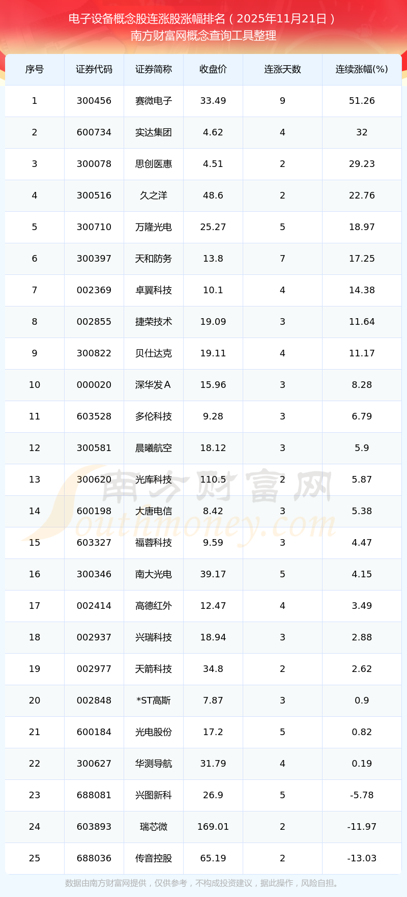 2025年11月21日電子設(shè)備概念股連漲股漲幅排名
