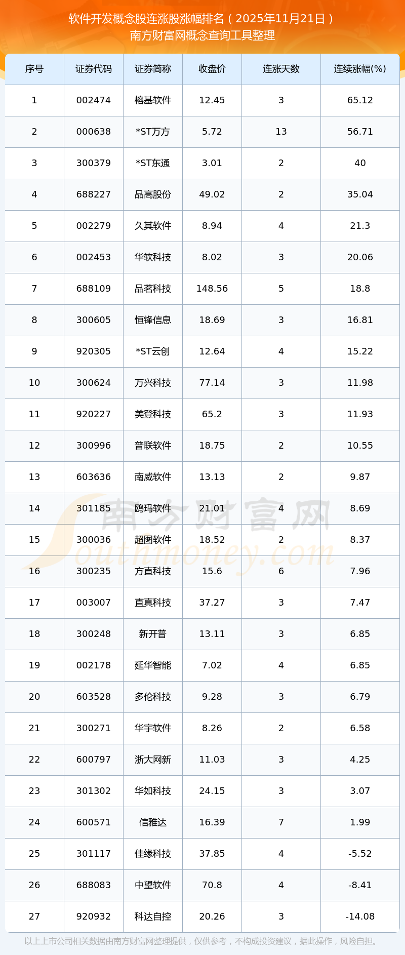 2025年11月21日軟件開發(fā)概念股連漲股漲幅排名
