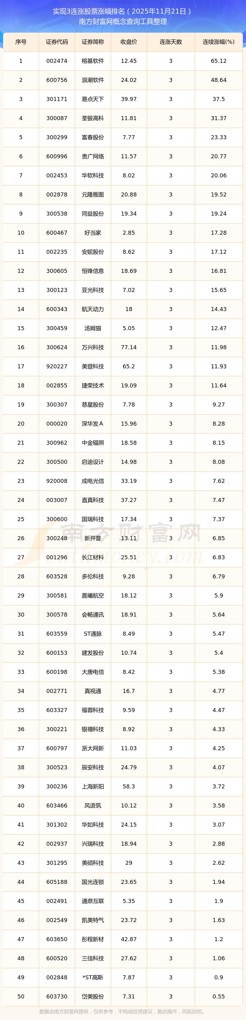 2025年11月21日實(shí)現(xiàn)3連漲股票漲幅排名