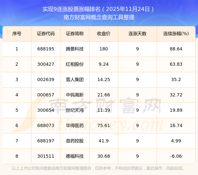2025年11月24日實(shí)現(xiàn)9連漲股票漲幅排名
