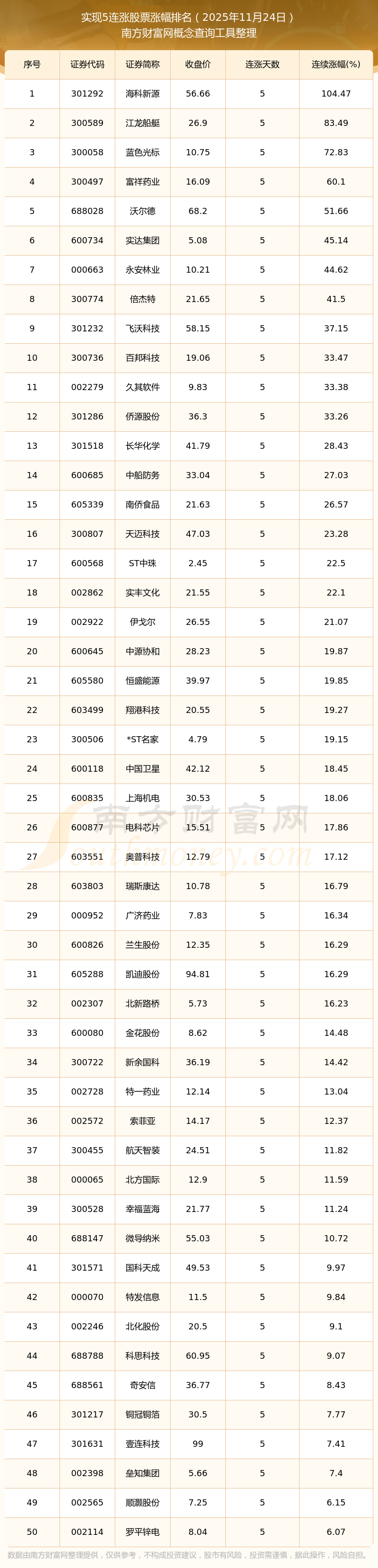 2025年11月24日實(shí)現(xiàn)5連漲股票漲幅排名