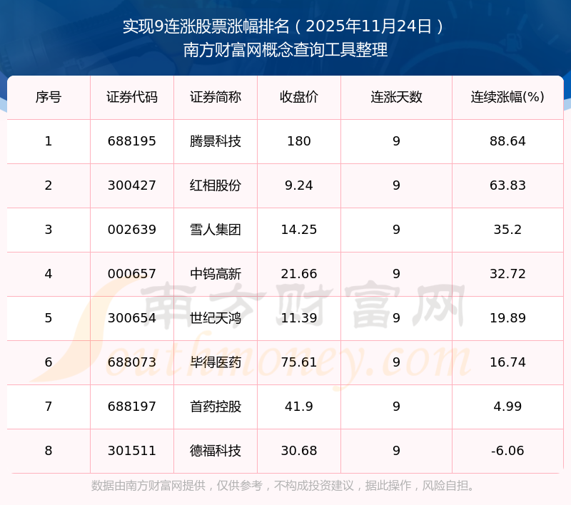 根據南方財富網概念查詢工具數據統計,截止2025年11月24日收盤,共有8只個股實現9天連漲。其中連續(xù)漲幅較大的個股有騰景科技、紅相股份、雪人集團等,連續(xù)漲幅分別為88.64%、63.83%、35.20%。