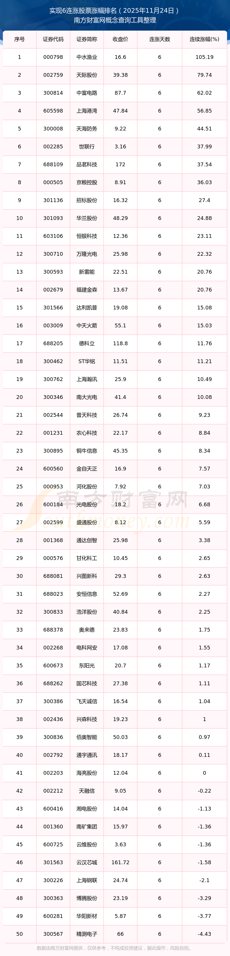 根據(jù)南方財富網(wǎng)概念查詢工具數(shù)據(jù)統(tǒng)計,截止2025年11月24日收盤,共有63只個股實現(xiàn)6天連漲。其中連續(xù)漲幅較大的個股有中水漁業(yè)、天際股份、中富電路等,連續(xù)漲幅分別為105.19%、79.74%、62.02%。