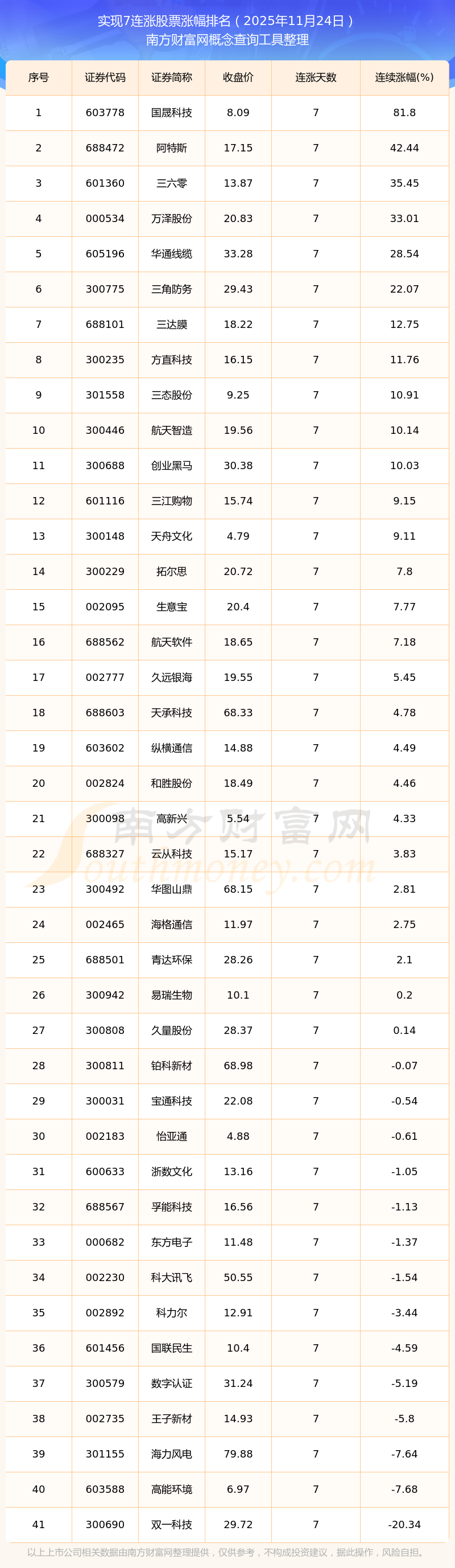 根據(jù)南方財(cái)富網(wǎng)概念查詢工具數(shù)據(jù)統(tǒng)計(jì),截止2025年11月24日收盤,共有41只個(gè)股實(shí)現(xiàn)7天連漲。其中連續(xù)漲幅較大的個(gè)股有國(guó)晟科技、阿特斯、三六零等,連續(xù)漲幅分別為81.80%、42.44%、35.45%。