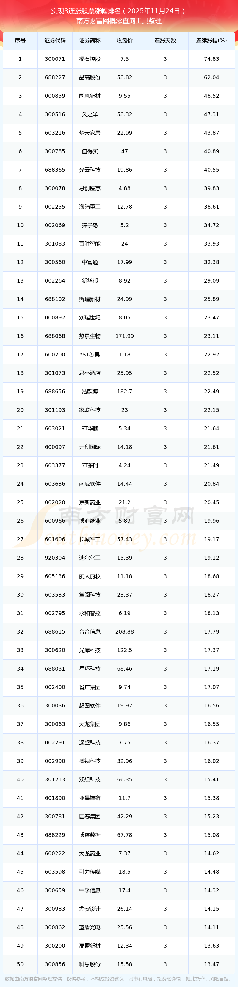 根據(jù)南方財(cái)富網(wǎng)概念查詢工具數(shù)據(jù)統(tǒng)計(jì),截止2025年11月24日收盤,共有350只個(gè)股實(shí)現(xiàn)3天連漲。其中連續(xù)漲幅較大的個(gè)股有福石控股、品高股份、國(guó)風(fēng)新材等,連續(xù)漲幅分別為74.83%、62.04%、48.52%。