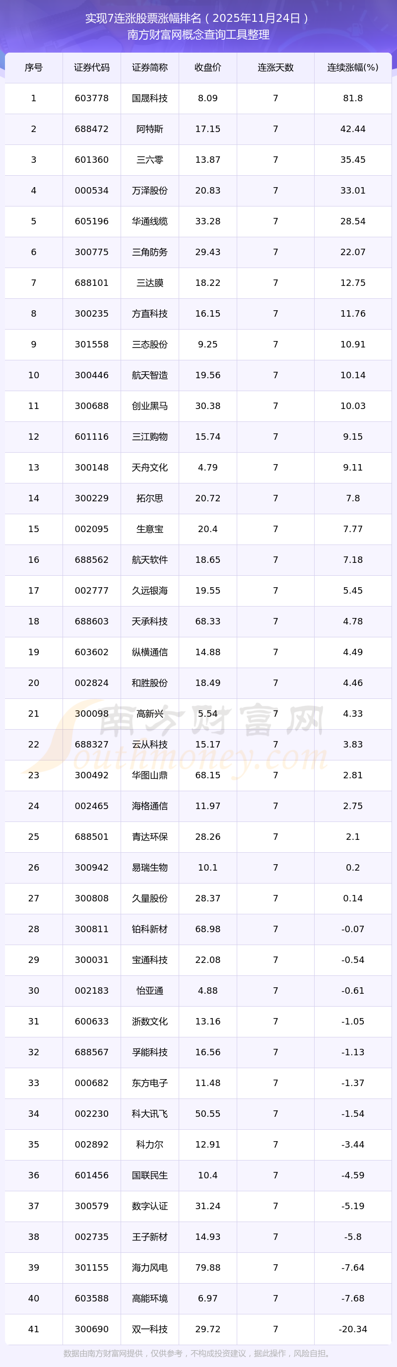 根據(jù)南方財(cái)富網(wǎng)概念查詢工具數(shù)據(jù)統(tǒng)計(jì),截止2025年11月24日收盤,共有41只個股實(shí)現(xiàn)7天連漲。其中連續(xù)漲幅較大的個股有國晟科技、阿特斯、三六零等,連續(xù)漲幅分別為81.80%、42.44%、35.45%。