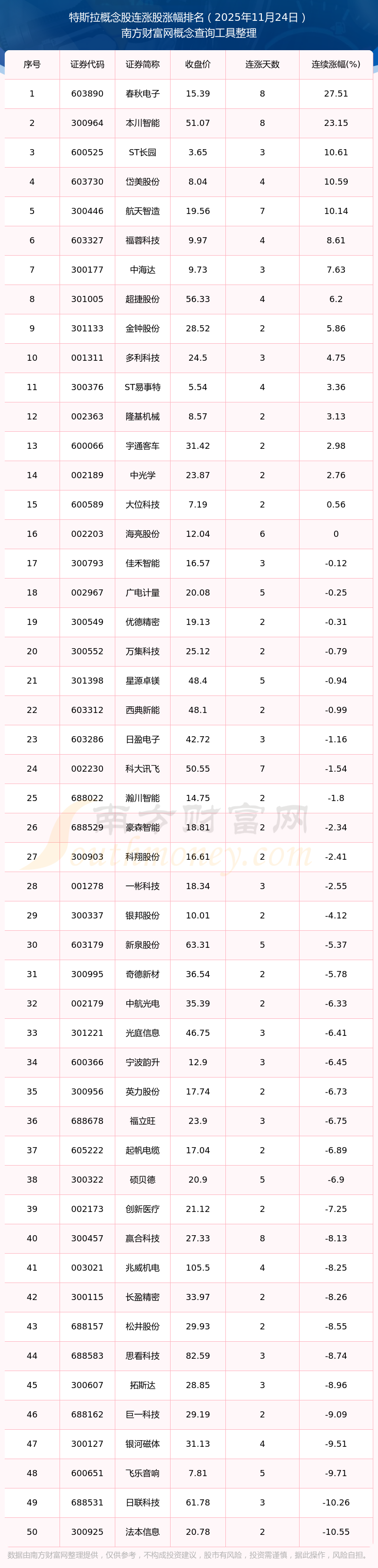 根據(jù)南方財富網(wǎng)概念查詢工具數(shù)據(jù)統(tǒng)計,截止2025年11月24日收盤,特斯拉概念股共有56只個股實現(xiàn)連漲。其中連續(xù)漲幅較大的個股有春秋電子、本川智能、ST長園等,連續(xù)漲幅分別為27.51%、23.15%、10.61%。