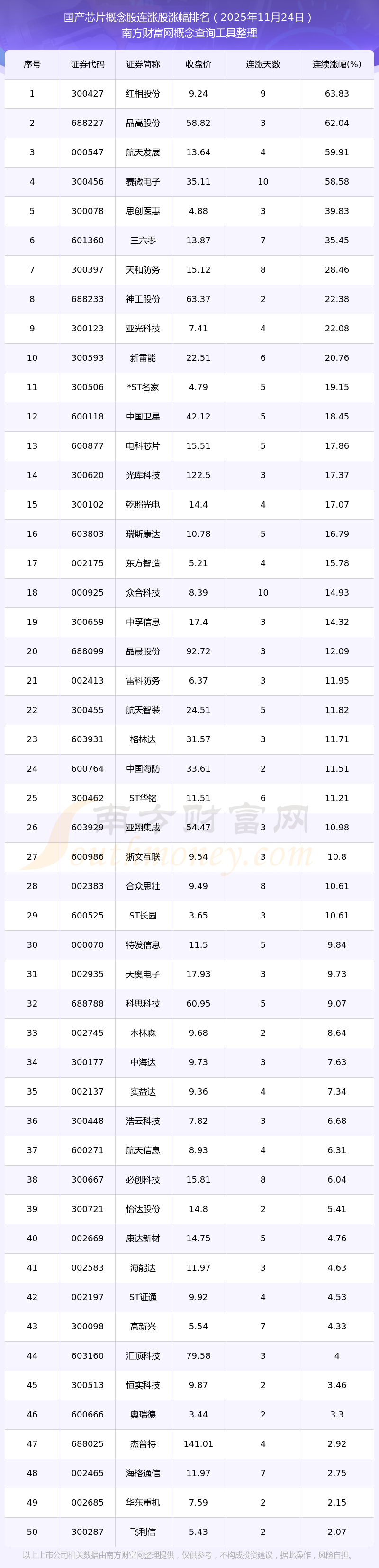 根據(jù)南方財富網(wǎng)概念查詢工具數(shù)據(jù)統(tǒng)計,截止2025年11月24日收盤,國產(chǎn)芯片概念股共有118只個股實現(xiàn)連漲。其中連續(xù)漲幅較大的個股有紅相股份、品高股份、航天發(fā)展等,連續(xù)漲幅分別為63.83%、62.04%、59.91%。