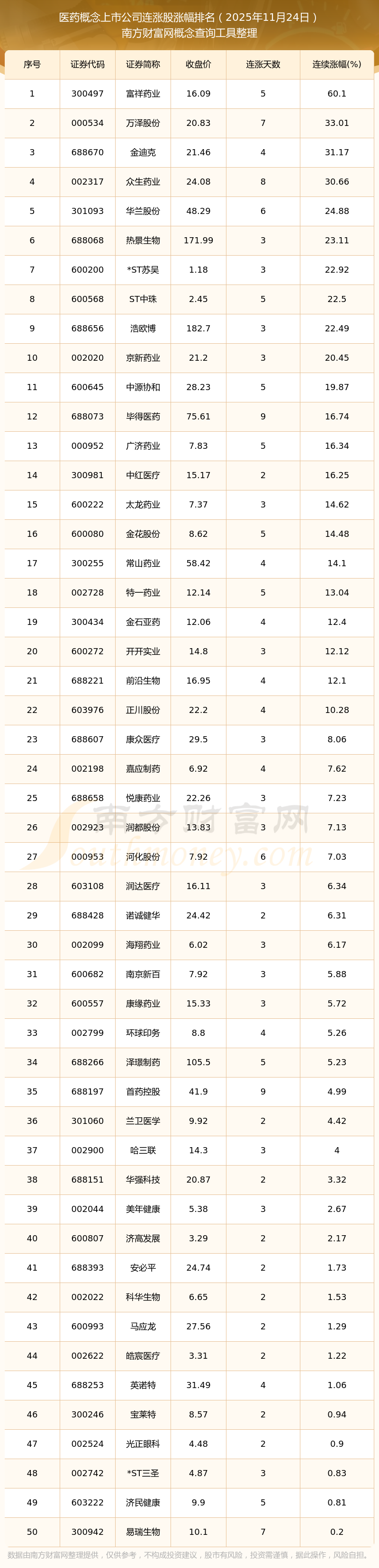 2025年11月24日醫(yī)藥概念上市公司連漲股漲幅排名