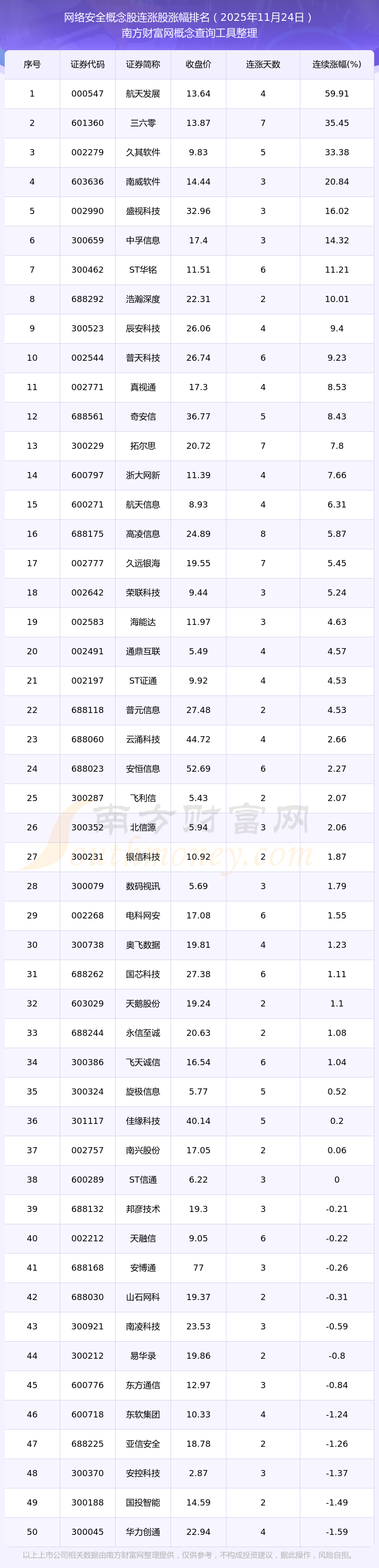 2025年11月24日網(wǎng)絡(luò)安全概念股連漲股漲幅排名