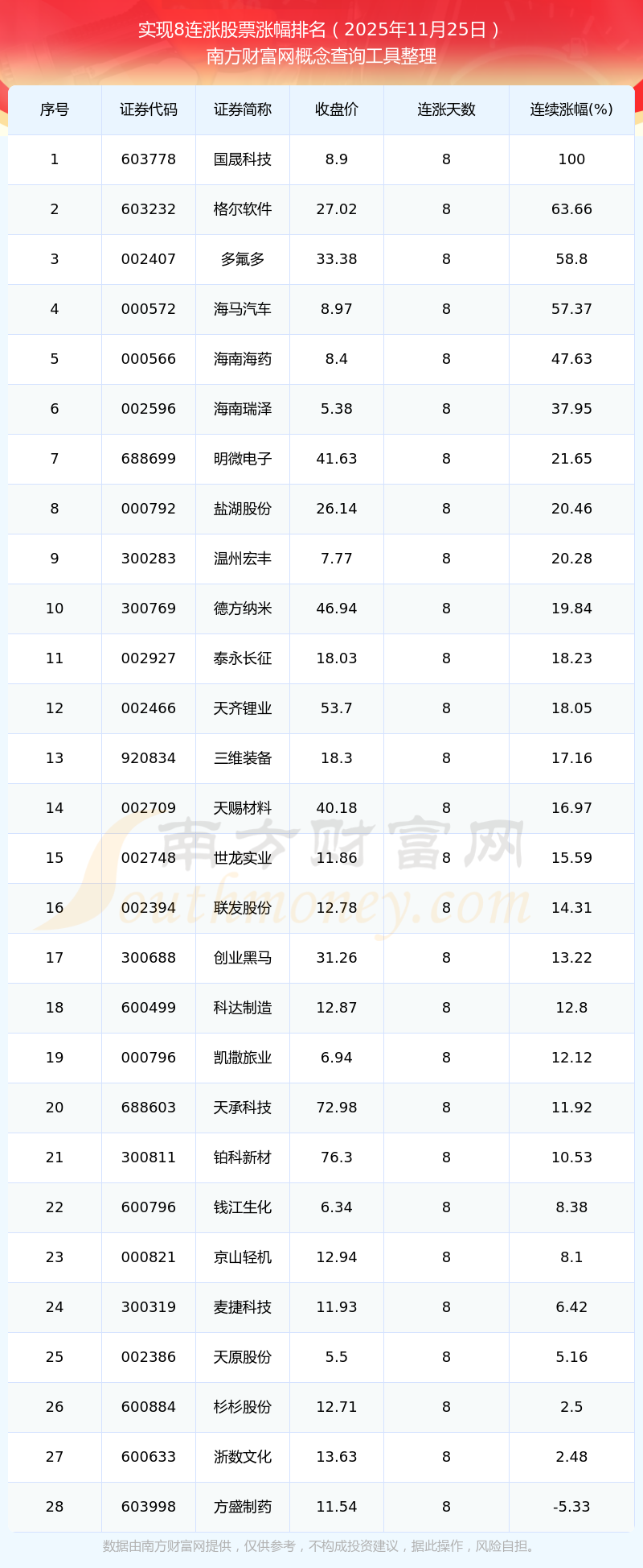 根據(jù)南方財(cái)富網(wǎng)概念查詢工具數(shù)據(jù)統(tǒng)計(jì),截止2025年11月25日收盤,共有28只個(gè)股實(shí)現(xiàn)8天連漲。其中連續(xù)漲幅較大的個(gè)股有國(guó)晟科技、格爾軟件、多氟多等,連續(xù)漲幅分別為100.00%、63.66%、58.80%。