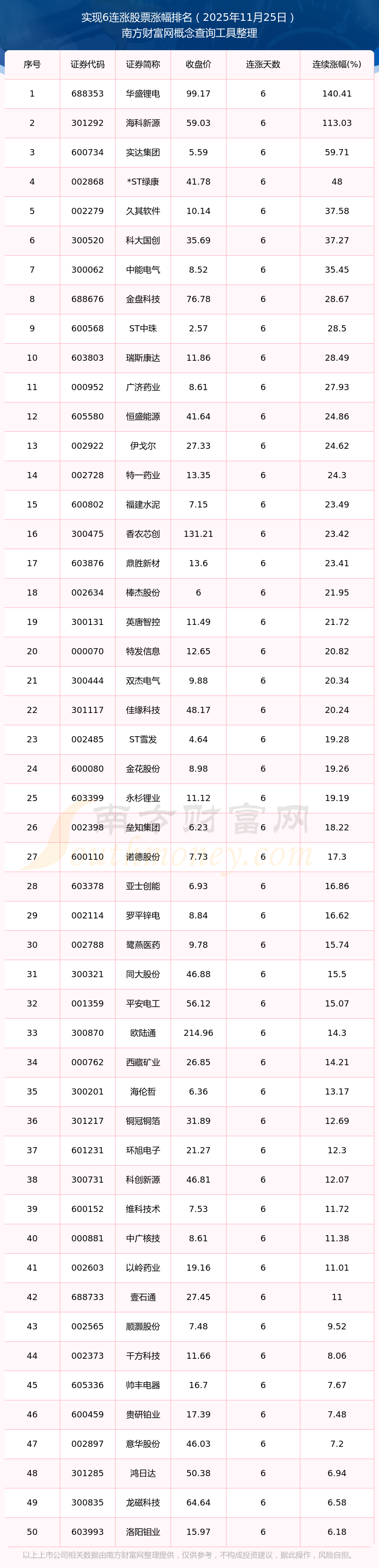 2025年11月25日實(shí)現(xiàn)6連漲股票漲幅排名