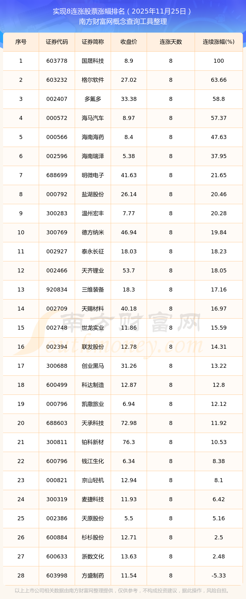 根據(jù)南方財(cái)富網(wǎng)概念查詢工具數(shù)據(jù)統(tǒng)計(jì),截止2025年11月25日收盤,共有28只個(gè)股實(shí)現(xiàn)8天連漲。其中連續(xù)漲幅較大的個(gè)股有國晟科技、格爾軟件、多氟多等,連續(xù)漲幅分別為100.00%、63.66%、58.80%。