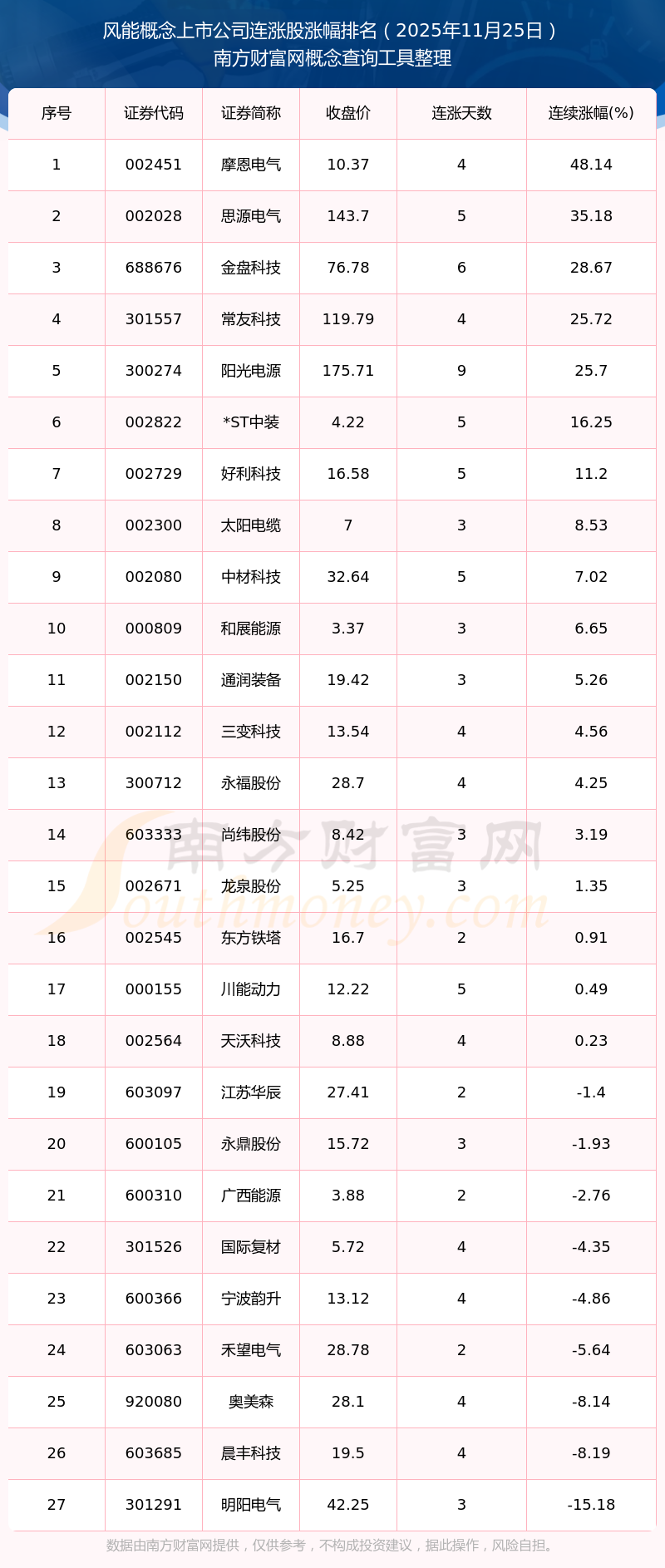 2025年11月25日風(fēng)能概念上市公司連漲股漲幅排名